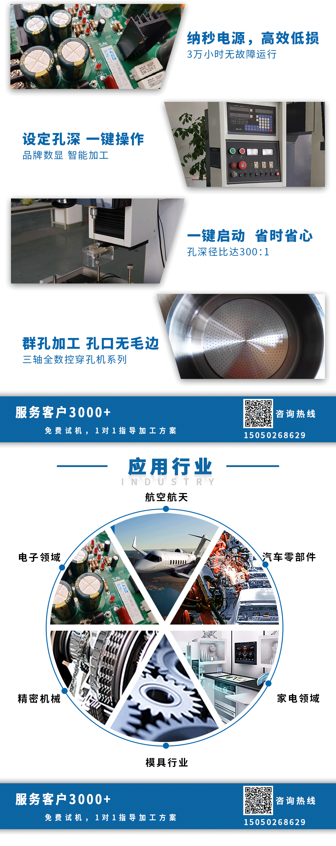 3.0mm,最大深徑比能達300 : 1以上加工速度每分鐘最大可達60mm ,工作臺X、Y軸配有數(shù)顯裝置。